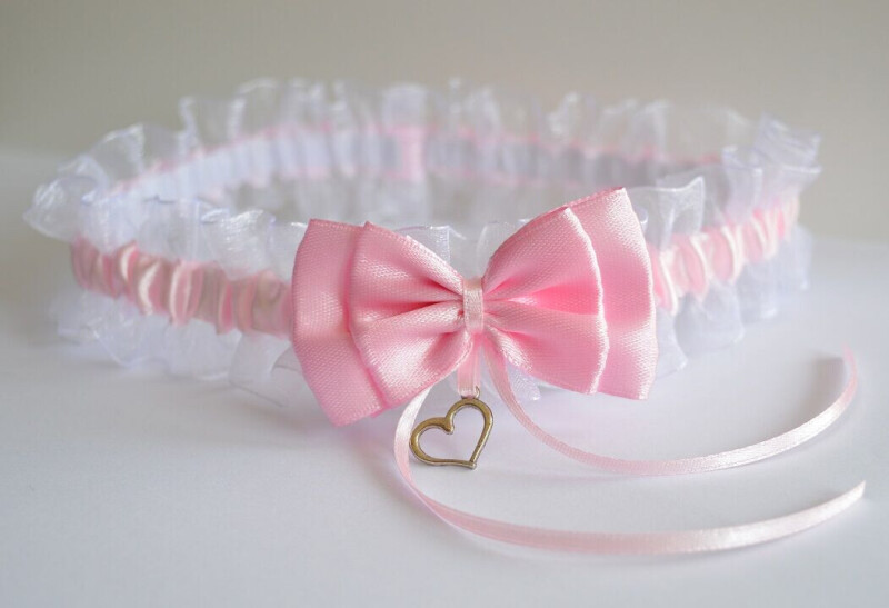 Šifonový podvazek v bílo-růžové barvě s mašlí a srdíčkem.