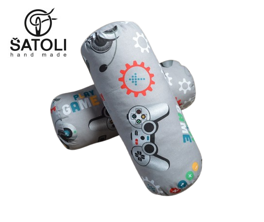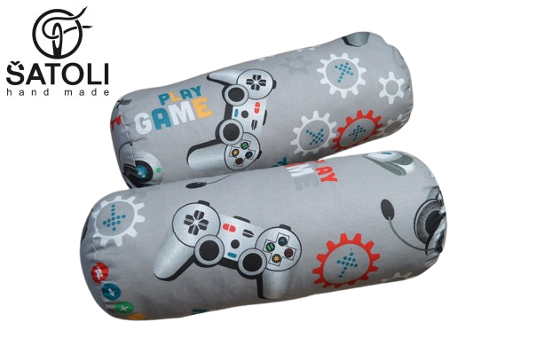 Polštářek z naší dílny ve tvaru válce. Průměr polštářku je 30 cm.