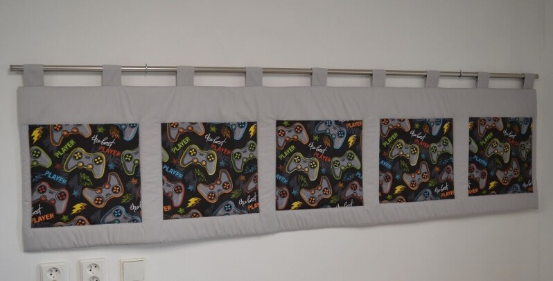 Velký kapsář za postel 200x50 cm - Herní motiv na šedé